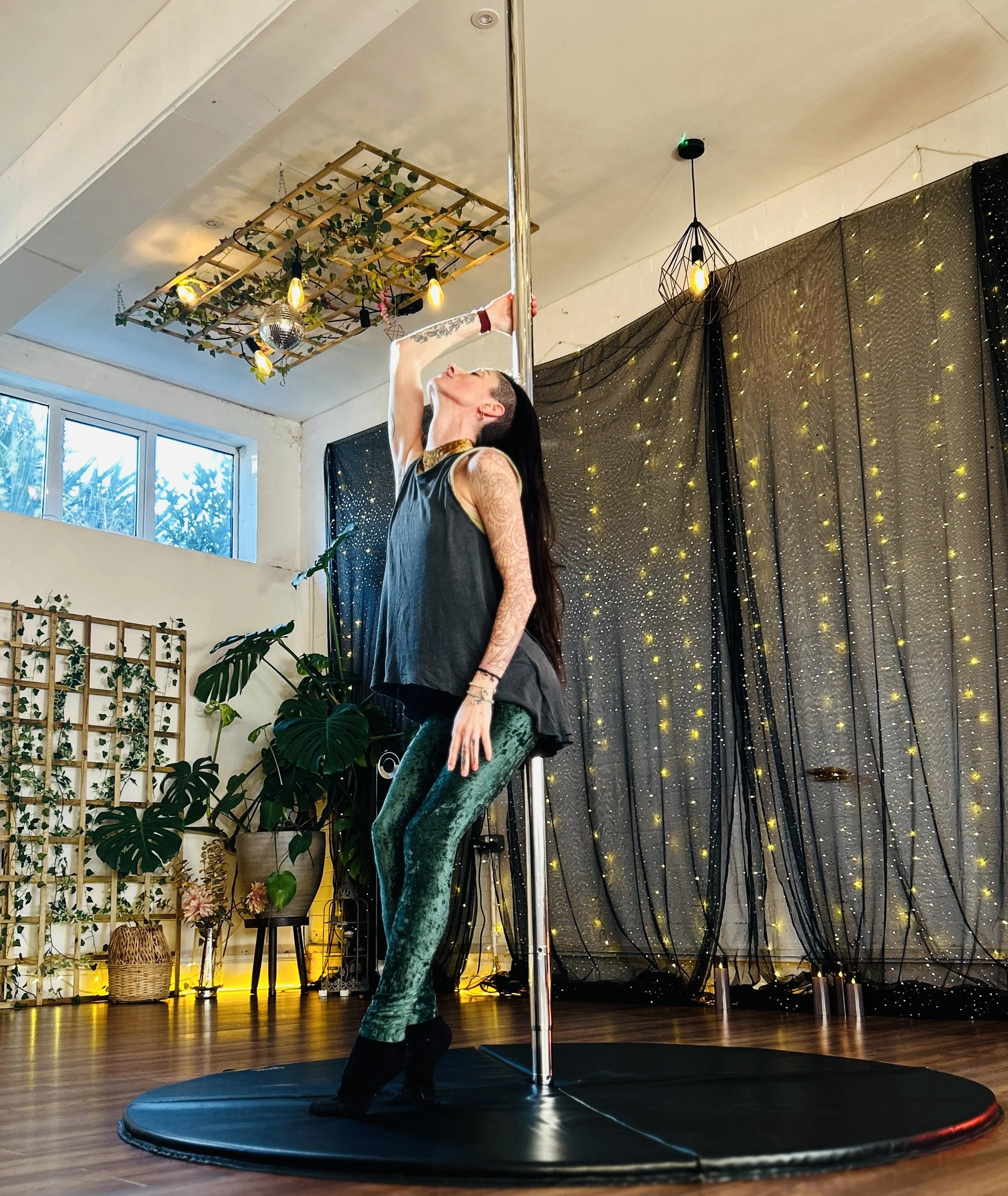 We focus on pole dance foundations — gentle spins, transitions, body awareness and flow — building strength and confidence steadily, in a way that honours your body exactly as it is. We learn in a way that honours the true roots of pole, and our own bodies.